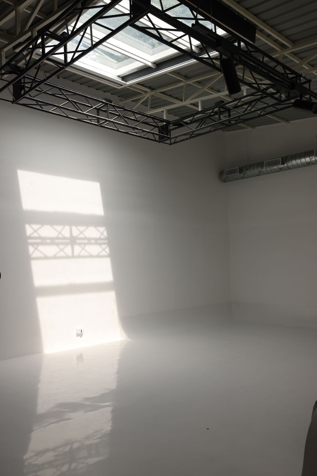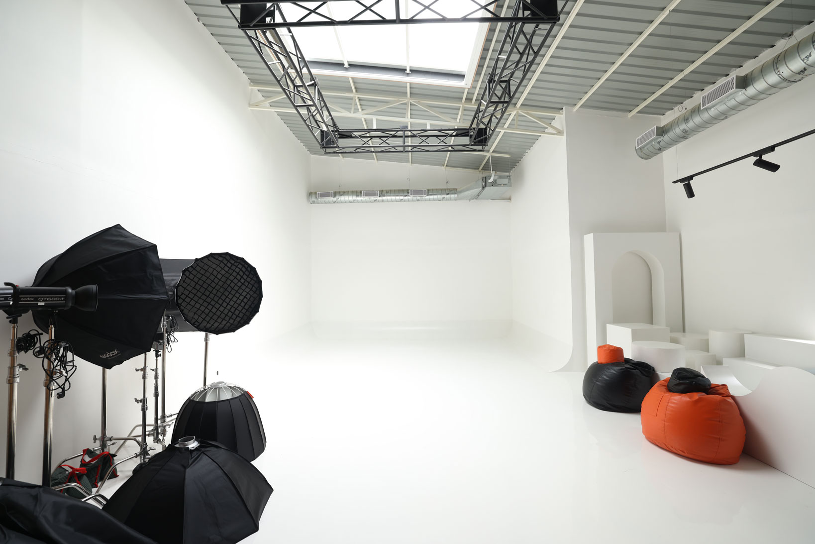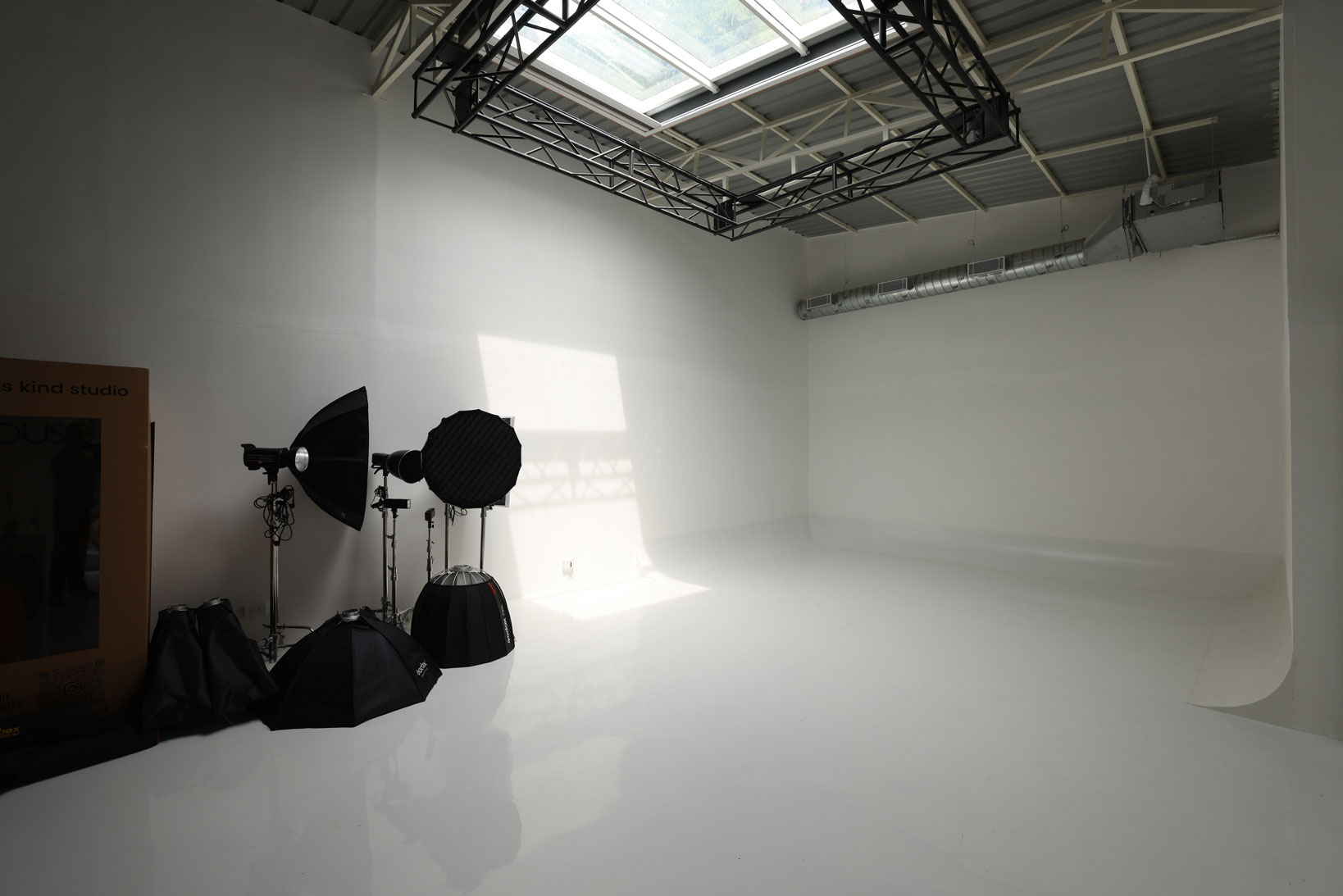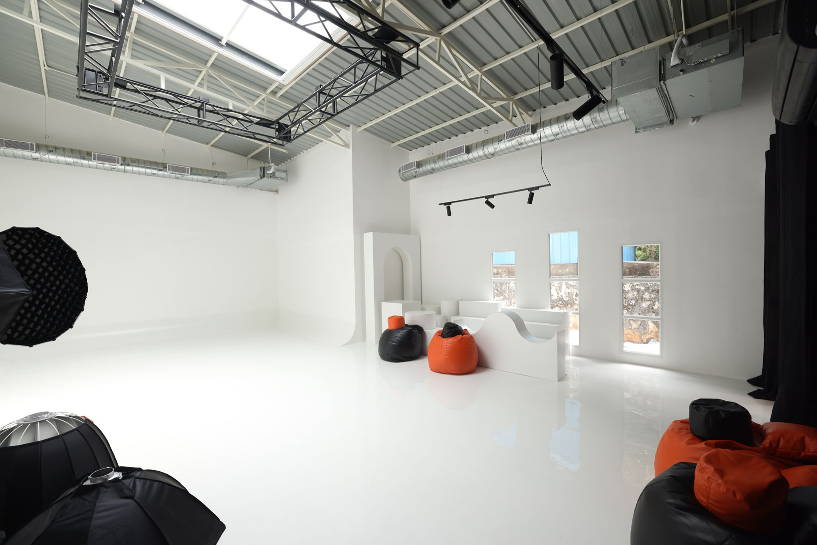 The space features 3 studios: Lumos, Spectra, and Vibrancy, perfect for daylight shoots (retractable roof), cyclorama white setup, podcast production, motor filming, and other custom content creation.